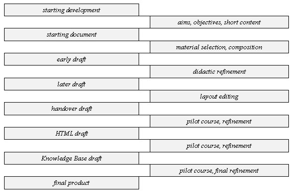 Fig. 1. Step-by-step development of learning materials During the development phase of the project, there were 3 pilot courses tested amongst a trial group of students. This testing process was designed to identify appropriateness of content, study materials and learning modes. It is critical to the project that adequate attention should be given to ensure that structures are in place to support the distance learning mode of the project. In this phase of the project MoARD and land offices nominated 120 students for the trial delivery of the course. These students were asked to evaluate all the study materials and to comment upon the standard and method of delivery of the course. A quality team monitors the distance learning aspects and advises on the ongoing development and delivery of the material. The three pilot courses tested step-by-step the development phases. 1.pilot: the content in a paper based ODL with teach-the-teachers approach, 2.pilot: the refined content in an Internet and CBT environment, 3.pilot: the whole ODL system. The Quality Management chart is shown below.