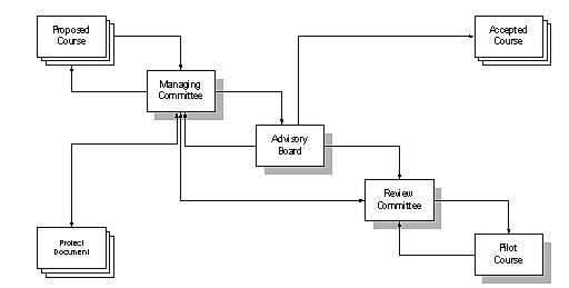 Fig. 2. Quality Management The delivery system will use a central knowledge base and 5 or more distributed learning centres in a networking environment. The full support will be available on-line, but CD will be produced for easy access to materials. From the HTML structure it is easy to produce paper copies. The human part of the learner support system is based on a network of tutors in 5 technical high schools and 40 mentors at land offices, while the technical one on Internet / Intranet facilities. The final evaluation is made by examiners at the technical high schools. METADATAThe course material development is based on knowledge base approach and the course delivery on a distributed environment. The CSLM acts as a knowledge centre developer, land office study centres and high schools are dealing with course delivery. This necessitates the extended use of metadata on the educational resources. Educational metadata should provide the minimum requirements to define the attributes required to fully/adequately describe the educational objects. The reason for creating metadata, from the provider perspective, is to improve the possibilities of retrieval as well as to support control and management of learning objects. As the volume of digital learning resources increase keeping track of, and identifying resources which is often maintained by different organisations becomes increasingly difficult. A cross domain method of describing learning resources is required. Metadata will help potential learners to discover what information is available and will help them to assess the suitability of that data for a given task. Distance learning materials and services with their abundance of different formats and control measures might not always be usable directly by everyone: the format might be unfamiliar or unreadable, the content might be encrypted, otherwise prohibited or only permitted after payment, the resource might be large, difficult or time consuming to access etc. In all those cases, metadata could support the learning process. Metadata will be crucial in implementing these strategic elements. Whilst learning units itself forms the building blocks of networked and inter-connected environment meta data is required to bind the units together and allow them to interoperate. Metadata is required to describe what learning units look like, how to build from them a learning route, what, if any refinements or value adding operations have been carried out on a unit. And in a networked environment what services can a tutor/learner request from a server and what parameters should the teacher/student send to the server to request the service. CONCLUSIONSSDiLA project is to complete the training structure and to harmonise co-operation at an institutional level between those organisations in Hungary which support and require staff development in Land Administration matters and to produce a continuing professional development system using digital technologies for the delivery of short courses at administrative, technician and managerial level in land and cartographic administration in harmonisation with EU standards. The SDiLA Project would greatly improve the knowledge transfer and allow us to really participate in the international educational development arena, rather than to become late users of systems and regulations invented by others. SDiLA aims to increase collaboration between EU and Hungarian institutions and sharing of learning resources. Co-operation will support specialization, improve quality, increase choice, and lead to a better fit with changing vocational demands in Land Administration. The job market in general will become much more dynamic, complex and heterogeneous. The increased complexity will increase the difficulty of optimising job offers and job demands. SDiLA assists to avoid these problems and to develop more market oriented curricula. Since the strategic aim of SDiLA is to directly support a European accession, the project will improve interaction beyond national boundaries and will facilitate the development of standards. Potential clients of SDiLA include not only Land Office staff, but professionals in land surveying, local governments, regional offices etc. The openness of SDiLA will also invite partners from Eastern European countries to participate in the dissemination. Metadata can be used to improve the search process, to build user-specific, guided paths, and to maintain relationships among disparate educational resources. We suppose that the continued success of the Internet is contingent upon automated tools that efficiently guide the information gatherer toward relevant and appropriate material. Ultimately, we believe that the Web will be a viable environment for providing individualized instruction applications for learners in Land Administration. REFERENCES