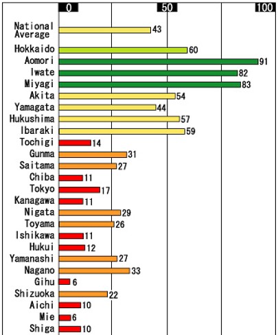 2. PROCEDURE OF CADASTRAL SURVEY(1) Survey Planning (process A, B) The municipality that is conducting the survey makes plans by contacting and adjusting with organs concerned. The municipality has to do the development of an enterprise plan, a public notice of the cadastral survey, the application of a necessary subsidy. The municipality prepares the specifications for their national land survey accordance to the standard specifications established by MILT. Then the municipality official holds a briefing on the survey's substance and necessity for local residents. (2) Basic control point survey The Geographical Survey Institute maintains the 1st to 3rd order control points as the national geodetic control point network. The network is not dense enough for the cadastral survey. The Geographical Survey Institute settles the 4th order basic control point based on the network with the request from municipalities. (3) Geographical control point survey (process C, D) Settle the topographic control point, which is the basic reference of survey. As process C, the triangle survey or the GPS traverse survey is done based on the 4th order basic control points. As process D, the traverse survey mainly using the total station based on the points from process C. Some case, aerial triangulation method is taken to settle these points. (4) The Parcel Investigation (process E) Landowners clarify their own land boundaries for Cadastral Survey. The municipality official in charge visits the actual place referring to data based on an old recorded map etc. The landowners concerning the boundary confirm their land boundaries with mutual agreement. The municipality official also investigates the landowner, parcel number, type of land and so on. Then they put piles along the boundary after the confirmation. The piles display the settled boundaries for each parcel of land. (5) Boundary Survey (process F, G) As process F, surveyors settle the dense topographic control point, and survey to determine the position on earth for each parcel. As process G, after determining the position for each parcel, surveyors make the accurate map (cadastral map) based on each results and measure the dimension. (6) Making Cadastral Record (process H) Integrating results of the Parcel Investigation and Boundary Survey, municipality officials make a draft of cadastral record. The record and map are displayed to the public for 20 days at the municipality. Every person can confirm the results of the cadastral survey. The municipality who has conducted the national land survey may request the president of prefecture to certify the maps and records. The president when he/she has received the request certifies products according to the examination into the products of the national land survey related to the request, unless the products contain a mistake committed in the course of survey in excess for the limit provided for by Cabinet Order. The MLIT obtain in advance the approval of the President. (7) Submit the product of Cadastral Survey to registry office The copies of Cadastral Survey product (the cadastral map and the cadastral record) are submitted to the registry office. The land registry book is revised according to the cadastral record and the old maps are replaced with the new cadastral map officially kept at the registry office. The registry office uses the product of the Cadastral Survey as a material of Immovable Registration in the future. 3. PROGRESS RATE OF CADASTRAL SURVEYCadastral Survey has been conducted since 1951 when National Land Survey Law was established. National Land Survey has been carrying out in accordance with the fourth Ten-Year National Land Survey Plan (fiscal year 1990 to 1999) on the basis of the Act on Special Measures for Promotion of National Land Survey until the end of fiscal year 1999. The progress rate of Cadastral Survey after the fourth plan finished (at the end of fiscal year 1999) stay only 43% of survey-required area and 17% for the urban area. Looking at the progress rate of each prefecture, we can see variation from region to region. Fig. 2 Progress rate
