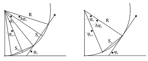 Figure 1: Bearing calculation of a) 3-point configuration, b) 3-GPS configuration The bearing could be calculated using the coordinates of three consecutive points [Figura 1a] (Klumpp 73). This bearing which in case of a curve is along the chord could be considered as parallel to the tangent applied at the middle point of the relevant arc. The exact location of this point on the trajectory requires the determination of the curve radius, which actually coincides with the determination of Δφn. Its calculation is based on three variables - φn, φn-1, Δφn-1 – which requires the use of three consecutive point coordinates. This indirect determination of the bearing leads to an accuracy depending on two types of error: the positioning accuracy of the three points and their distance S - pace of observations [Table 2]. Furthermore, the location of the arc middle point [thus the distance from the start] depends on several parameters and calculated variables. The most important are the pace and the number of points [two inversely influencing variables], as well as the errors of the bearing and the positioning. Collecting data located in very short pace, a large fluctuation of bearings may result. In this way, the calculations of geometric elements are uncertain, since the variance of these measurements is significant compared with the value itself of the bearing change. Thus, for machine guidance moving slowly measurements of points located at least a minimum distance must be used. However, this may result to a lack of the position and orientation of the machine for considerable time period fact that is unlike. The effort to deteriorate the bearing error, decreasing the positioning error and standardizing the distance between the points that calculate the bearing, was the motivation of this research. This has been achieved by performing simultaneous [synchronized] measurements of two distinctive points located on a triangle with sides of standard length. 3. A NEW CONFIGURATION (3-GPS CONFIGURATION)The new configuration consists of a triangle with three GPS receivers. In this way, all three vectors, that is pitch, roll and lead can be followed leading to bearing measurements for course and superelevation rates, while the position of the machine baseline is also continuously available. The determination of bearings may be calculated using Doppler from the code measurements, or direct measurement from the phase rate. The first way appears to be less accurate (baseline measurements with a significant noise), while the second it is not available with the commercial GPS at the present time. A third method used herein uses the coordinates of the 3-GPS points, getting in this way a mean value of two available bearings [the 3d is dependent on the other two]. To satisfy the paving operation specifications DGPS method is appropriate using Real Time Kinematic [RTK] (O' Connor 96) with On The Fly capability (Hatch 91). This technique allows the users to obtain centimeter-level up to five times per second accuracy while stationary or moving [horizontal accuracy of the order 1 - 2cm and vertical accuracy 2 - 4cm while in continuous kinematic mode]. Because these are not adequate for paving, applying a Kalman filtering [i.e. constant velocity model] the provided positioning accuracy could be improved by a factor of 3. This is especially because the dynamics of the whole procedure are extremely low [0.06 - 1km/h] and Kalman filtering acts in fact almost as a least square adjustment. Additionally, regarding cross-slope inclination etc., the relative position of GPS antennae could be obtained with much better accuracy than the absolute position in space of a single antenna, as those three antennas "phase" commonly most of the systematic errors of the GPS system. As a result, the pitch, roll and lead rotations can be obtained with much higher accuracy than the absolute positioning itself. It is expected that the differential phases would be sampled simultaneously removing in this way the variations of time biases. Actually these errors may be of several centimeters (Zimmerman and Cannon 97). After the application of the above described techniques, it was expected that the provided accuracy could be better than 0.5cm horizontally (σ2X) and 1cm vertically. Especially, when the machine moves slowly within road sections of small length (of the order of 4meters), the systematic error does not change more than 1cm for time period between 4 minutes up to 1 hour. In this case, the relevant position between the antennas would be measured with accuracy better than a few millimeters both horizontally and vertically. Obviously, the usual GPS sources of errors may confine the accuracy and the effectiveness of the system; that depend on the availability of fixes, a possible problem when there is obstruction in-between the satellite-receiver sight or other reasons [i.e. other sources of transmission]. Nevertheless, a number of benefits must also be mentioned. First, the fluctuation of pace does not influence the accuracy of the bearing and actually the accuracy of the distance from the start. Second, the very small pace does not influence heavily the determination of path characteristics. Third, although a selection of data may be realized [i.e. data every 1m in the average] for these determinations, there is a continuous position and orientation of the machine. A second configuration consisting of two robotic targets, placed on the machine, and tracked by two non-moving robotic total stations was also investigated. However, the experiment led to immature results, which are not further referred to. Initially, during the first experiments problems of synchronizations appear, which only were overcome in latter efforts. Thus, two different total stations were used with incompatible synchronization and different rates of collecting data. The outcome was that there were completely independent measurements of two arbitrary points 