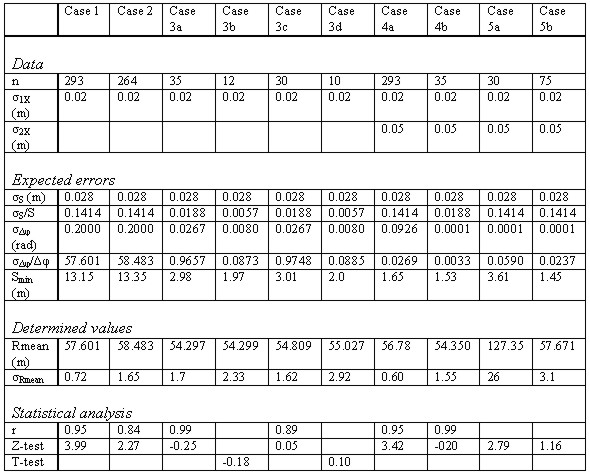 Table 3: Expected errors and statistical analysis (5% level of significance: Z=1.96, T=2.20 and n-1=11, T=2.26 and n-1=9) Second, increasing the pace using both DGPS and a robotic total station positioning techniques indicates that in general a significant improvement of the radius value and its accuracy may be achieved [cases 3a,3b,3c,3d]. However, for small curves (60m length) the increase of the pace leads to relevant decrease of the number of points, which results to possible small samples. Obviously, there should be a value of pace than further the accuracy may be degraded, which is expected to be greater than 5.0m. Additionally, it must be mentioned that all calculations were based on the fact that the chord approach satisfactorily the arc [Table 1]. For large chords (say around 15.0m) this does not hold and a further correction should be made which complicates the error analysis calculations.