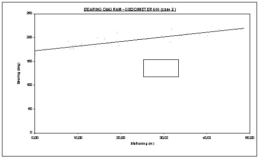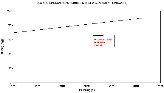 Figure 4: Bearing diagram including all data mean pace: 0.20m Third, although the pace was hold to a very small magnitude, the 3-GPS configuration shows a considerable improvement in calculating the radius [case 4a]. However, in the field this improvement was not fully proven, since the radius value was accepted to represent the real value by its accuracy is hold low. Contrary, the regression coefficient shows an excellent correlation, which indicates the high capability of the method to recognize the circular path. This results to accurate estimation of the stationing of various points (when the radius is known from the CAD), and further an accurate estimation of the ending point of the curve. Additionally, the sensitivity of recognizing a path deviation is high (Smin=1.6m), and most important being independent of the mean pace of observations.