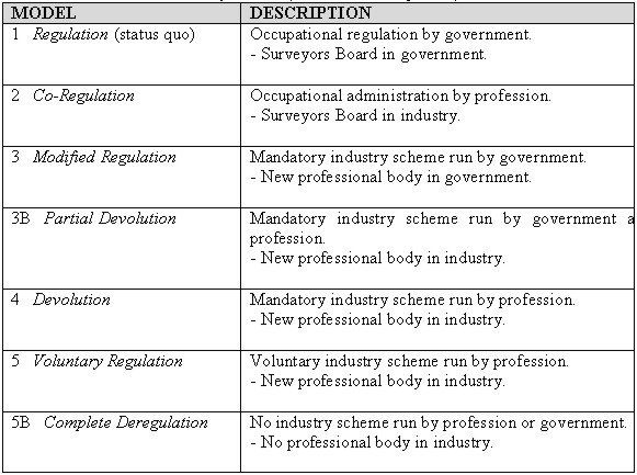 The major role for Government will be to set the standards and quality assure the inputs to the cadastre and the geodetic infrastructure. The Surveyor General's role, in terms of its regulation, is as the principal administrator of land surveying is to develop policy for the active development and maintenance of the cadastral surveying infrastructure. As custodian of the surveying elements of the cadastre, the Surveyor General has primary responsibility for the surveying of boundaries for both Crown and freehold land. This project promises to deliver many benefits to the community, industry, the surveying profession and Government. There will be continued integrity and efficiency of the Victorian land registration system with improvements made to the quality of the data inputs and the physical infrastructure that supports the Victorian cadastre. It is envisaged that more responsive professional administration will result from the Recognised Professional Body (RPB) managing the surveying profession and promoting professional best practice. Surveying customers will have access to better and user-friendly information with a transparent complaint resolution scheme. Victoria will contribute to the development of a national land surveying agenda that will hopefully progress towards a national system of registration and national standards for competency and changes to the cadastre. There is growing support for addressing many land surveying issues in a national context. Most importantly, the RBP will be fully accountable to Government. 7. REGULATORY ROLES AND RESPONSIBILITIES [IN REGULATION]Several models have been developed and documented by the industry and Government partnership for the regulation and administration of surveying in Victoria. The models outline revised roles for both industry and Government and stipulate the domain and responsibilities of the controlling body for registration ie. Surveyors Board or a RPB. The seven models developed facilitate the progressively greater reform of the existing framework. A table of these models from the current regulated system through to complete deregulation is shown in Table 1. Table 1: Seven Models for Survey Reform (Source: Gen Group, 2000)