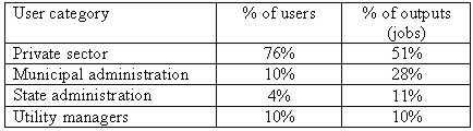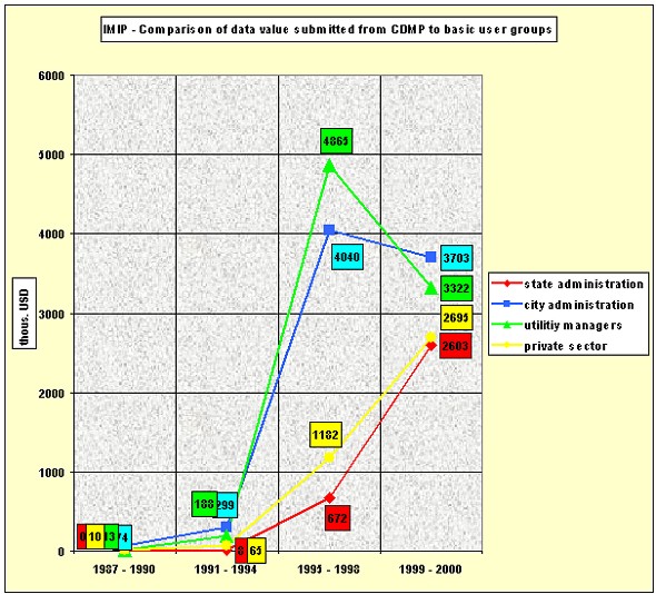 As can be seen on Pic.3, it is obvious how the interest of individual groups for CDMP outputs progressed. Up until 1994, users could have the outputs from UDMP only. At that time, 14% of the Prague area was completed. The interest was outweighed from the side of utility managers and the municipal administration. In the period 1995-1998, interest rapidly increased due to the finished DRM, DORT (since 1997) and UDMP (completed for 64% of the Prague area). As in the previous period, the most significant users were the utility managers, who started to build their own information systems. In addition to these activities, the data delivery to the municipal offices increased (Prague has 57 municipal parts). In 1993, 15 municipal offices used the CDMP data. In 1996, however, the number rose to 45 and presently 56 municipal offices use the data. The interest from the side of state administration and universities was significantly influenced by the combination of the UDMP and DORT. The main customers are financial offices, the Ministry of Finance, the Ministry for Regional Development, the Czech Office of Geodesy and Cadastre, the Czech Statistical Office and the Office of the Czech President. From the universities, the users are mainly the Faculty of Architecture and the Faculty of Civil Engineering of the Czech Technical University in Prague. The interest in the private sector increased slightly, but since 1996 it represents the highest growth. Finally, the private companies could afford the appropriate HW and SW equipment. It is quite interesting to compare the relative shares of the user groups in the total data amount: