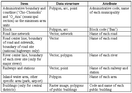 These data sets have been published from April 1997 for the use of unspecified individuals at an appropriate price, just as the Digital Map Series. They are also distributed free of charge to every local government that provided data sources. The whole planned area was covered in March 2001. 5.2. SDF25000Table 3 indicates the content of SDF25000. Table 3. Contents of the Spatial Data Framework 25000