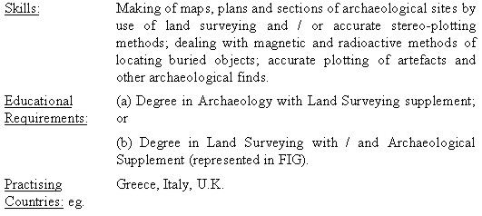 THE ROLE OF NON-GEODETIC PROFESSIONAL EXPERTISE OF A UNIVERSITY EDUCATED SURVEYOR IN AN EMERGING AMBIGUOUS AND UNSAFE FUTURE OF THE PROFESSIONDr Basil PSARIANOS, GreeceKey words: surveying qualifications, non-geodetic surveying. AbstractNon-geodetic activities practised around the globe are not adequately known to the surveying society. However such knowledge will help the profession overcome its current problems and redefinition of the surveyor will ensure his survival in an era of globalisation. In this paper therefore a brief description is given of the main existing non-geodetic activities associated with a surveying title, with their educational requirements and countries in which they are practised, and which are either not represented or under-represented in FIG. 1. INTRODUCTIONIn an era that is characterised worldwide by free market rules, unrestricted movement of professionals and globalisation accompanied by high qualifications and expertise requirements, professional titles and definitions have lost their original meanings and contents. This trend is quite evident in the old and traditional professions, such as medicine, law and engineering. It was quite evident for example 200 hundred years ago that a doctor was called upon to cure almost every malady by applying every known treatment at that time including all kinds surgery; and an engineer should be able to cope with a variety of technical problems extending from building houses to bridges, even ships. In modern times however traditional professional names, i.e. civil engineer, surveyor, etc. have a very abstract meaning, and speaking in market terms they are fully incomprehensible. Under professional names a large number of professional activities are understood, which are associated traditionally with a specific profession. Indeed professional names represent nowadays an umbrella-name underneath which specific activities are covered. Belonging to a profession is not nowadays sufficient for carrying out a successful career. Professions are developed in modern times on the basis of compliance to the fulfilment of the requirements of a specific job description, i.e. to be an expert in a specific field, which in turn will provide an individual with the capabilities to carry out successfully a specific job. Surveying being one of the oldest technical disciplines is no exception to this rule. But in addition to the general features that are imposed on all professions worldwide, the surveying profession is suffering from some specific and endogenous problems. 2. THE SURVEYING PROBLEMSurveying in the beginning of the 21st century is confronted with two significant challenges: