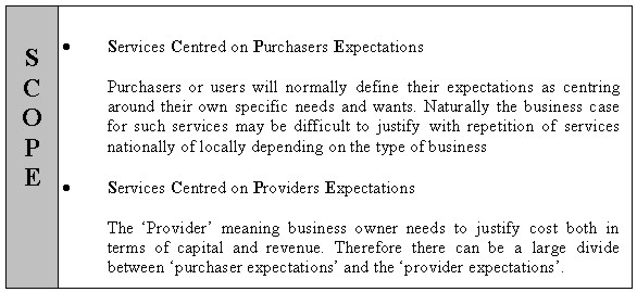 Figure 1. SCOPE Parameters The SCOPE model (Figure 2) allows a dual focus which in turn providers the arena to determine the key factors that will set the template for consideration for coalface facilities planning. The model was applied to current NHS provision within the Royal County of Berkshire in the UK. The application would be undertaken in two specific provision areas, namely local general practice facilities for a particular urban centre and secondly hospital services across the county as a whole. With this information 'Stage 1' of the SCOPE model would be applied to these two provision areas. From this information the research could be further developed to identify the practical steps needed to adapt and rationalise the current facilities to meet the revised business strategy. The planning process could then follow a process similar to that proposed by Then (1996) who identified Strategic Facilities Briefs and Service Level Briefs in the context of strategic and operational management. This would correspond to the second stage of the proposed model.