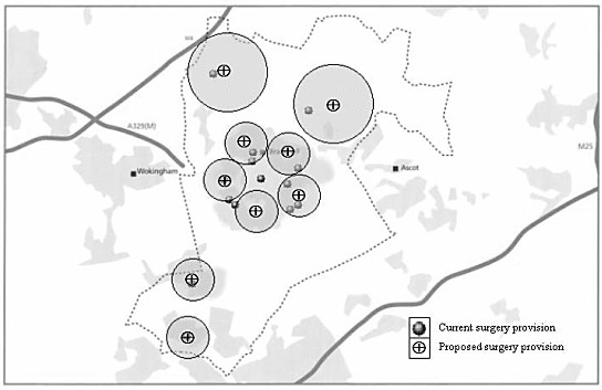 4. INTERPRETATION & DIALOGUEThe initial research undertaken did not show a clear strategy for implementation had been thought through at this time. The paper therefore sets out its own interpretation based on the analysis completed to date within the context of the proposed model. From the completion of the models Stage 1 a framework of healthcare provision can be proposed in an idealistic form which can provide clear parameters based on population density and distribution together with an understanding of customer wants and environment changes and forces. A survey was undertaken in January 2000 by the local Healthcare Forum, which comprises of local authority and local/county wide healthcare representatives. The aim of the study was to identify healthcare patterns within the local population of 101,000 to determine the users perception of their healthcare needs and wants. A questionnaire was sent to 43,500 homes of which 14,408 were returned, approximately one third. The questionnaire asked residents about their use of hospital based services and community based health services together with views on ease of travel and what services they would want to be provided more locally. The results were published (Bracknell Forest Health Panel Forum 2000) and showed that 55% of the respondents within the last twelve months visited the hospital within 15km of the town centre while 23.5% visited the hospital with a 25km radius compared with 21.5% who visited the hospital within 20km. Interestingly a large hospital within 22km was not identified as being visited. A large majority of the respondents (83.5%) identified that the nearest hospital (15km radius) was 'very' or 'quite' easy to access. One in eight (16.5%) travelled by public transport with the remainder using their own transport either as the driver or as a passenger. The survey identified that the greatest use of health services was the family doctor with 91.9% of respondents having used these service within the last twelve months. The survey further identified the healthcare 'wants' of the local community, which showed that nearly two-thirds stated they would like a more locally based Accident & Emergency (A&E) facility, one third mentioned the provision of a minor injuries unit and just under one third identified an out-patients clinic as being an important local service. The hospital based within 15km of the town center provides all the services identified by the respondents as being important. The survey data helps identifies the services that healthcare users perceive as important in terms of local provision together with an indication albeit by default of the acceptable travel distances for such services to provided within. Application of the Scope Model to this case study highlights the importance of the two-stage approach with the business focus leading the strategy. Stage one of the model incorporates the needs and views of 'purchasers' together with an analysis of physical assets and environment changes which in this case include Governmental moves to increase primary care with more and more services being centered around the family doctor. From this standpoint only can you then proceed to consider the strategy relating to the physical asset. A simple outcome of this case study when applied to the SCOPE Model could see the resultant facilities strategy. Currently there are 14 doctors practices serving the local healthcare economy under review, the research proposes a criteria that one practice should serve a population within a 4km radius with locations centralised within current or proposed transport infrastructures. By mapping locations based on this principle (see figure 3) it can be identified that the current provision of 14 practices can be reduced to 9. Areas of reduced population density would be served by practices with a greater circle of coverage say 8 - 16km mile radius. A 'walk-in centre' providing non-appointment services rather than being a dedicated doctors practice could serve the centre of the town. Simplistic although this process has been it has identified that purely setting a strategy based on facilities does not produce a cohesive business/customer led focus. The exact diameter of service coverage is not particularly relevant more that a framework has been applied which allows a qualitative analysis of service needs and strategic application based on the analysis interpreted under the SCOPE model. A similar exercise was applied to hospital provision applying a 15km radius based on the surveys findings that such a distance was acceptable in principle in locations with high population densities. Where densities are more wide spread e.g. for rural areas, catchment areas for hospital would have to be wider. This was plotted on the existing service provision map (see figure 4) and showed that current allocation of 17 hospitals could be reduced to 4. Naturally the original number of hospitals provided services for elderly and this may need to be added to local provision, as large travel distances may not be appropriate for such users. Areas with low population density could be served by mobile satellite services coming from the main hospitals linking with the increased services identified earlier that could be provided at the practice end allowing communication links with the hospitals reducing the needs for visits.