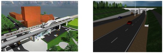 Collection and preparing 3D spatial information of objects under and above the ground is available with designers, mostly as CAD models (see figure 5). Therefore, it is examined how this information can be used and what conversions and generalisations are needed to obtain the (spatial) relevant information, like the outer boundary of the object. The transformation of a local co-ordinate system to a national reference system is object of special interest. Besides, two possible representations of z-co-ordinates are studied: an absolute z-co-ordinate, defined in the national reference system and a relative one, defined in relation to the surface. When z-co-ordinates are stored in a national reference system, the height of surface parcels is needed to be able to define geometrical and topological relations between the 3D objects and the 2D parcels. In the Netherlands, the horizontal location of a fixed point can be defined in the national reference framework. The Netherlands' Kadaster maintains this framework (co-ordinate system), by means of 6000 points for which the exact location is determined and preserved. The vertical location of a fixed point can be defined in respect to NAP: Normaal Amsterdam Peil (Amsterdam Ordnance Datum). This is the tidal plane of reference used in the Netherlands to measure the altitude of land and structures. The NAP is visible in the landscape by about 55000 marks. These marks are placed in buildings, bridges etc.. Almost everywhere in the Netherlands a mark can be found within one kilometre, which can be used for height determination. The Department of Public works is responsible for maintaining the height marks. The alternative is to collect and measure 3D data, but this can be very difficult in the case of subsurface constructions. The Kadaster should develop work processes and procedures to validate the 3D geo-data generated and supplied by these methods.