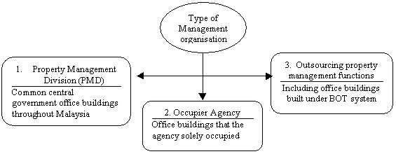 Apart from that, the importance of effective property management in public sector can be perceived in many ways. Firstly, public sector organizations in Malaysia are among the largest property owners and the richest in the term of operational property value (Ismail, 1996). Property can therefore, be considered as having financial contribution and effect upon annual financial statements, asset base and as well as on resale values in the case of privatisations of any public entities. Secondly, in the events of economic and financial crisis, effective property management in public sector would improve property performance through quality improvement and control cost. Finally effective property management deliver quality service to its end-users i.e. public sector employees. It should be noted that the federal government departments have the highest number of employees in their organizations of about 800,000 that occupy majority of their office buildings. 3. PROPERTY MANAGEMENT IN MALAYSIAWhat do property management entail? Managing property involve establishing goals, objectives and policies and implementation of strategies to achieve those goals and objectives. According to Singh, (1994,1996) property management is an activity that seeks to control interests in property taking into consideration the short and long term objectives of the property owner and particular purpose for which the property is held. From practical perspective Wong (1999) considers property management as the work carried out to manage and maintain the development including its facilities at the level that will retain or enhance the value of the development, create a safe, functional and conducive living environment for occupants, keep or restore every facility in efficient working order and in good state of repair, and project a good appearance or image for the development. In a study on the operational property management process in large non-property organisation in Malaysia, Ismail (1996) regards property management responsibility include all the necessary reporting, accounting, maintenance and decision making to ensure the economic and physical vitality of property assets. In this view the author looks at three aspects that are the management of the non-physical aspects of buildings such as legal and tenure matters, the management of physical aspects of buildings such as building maintenance and the economic management of the operational property assets, such as acquisition, disposal and development of the property assets. The core of property management may thus involve the management of the physical asset, which include maintenance; organisational use management, which include space management or user requirements; and financial management, which include property valuation, acquisition and disposal, property investment management and tenancy management. In Malaysian office sector, the public property management focus towards building operation that involves maintenance management, space management or user requirement of space and security management. Public sector organisations also undertake property valuation, acquisition and disposal, which are normally focus for development of new office buildings. As far as tenancy management is concerned, the involvement of public sector organisations is limited to the occupation of office space in private buildings. On the other hand, from property investment management aspect, the central government organisations are not involved directly but rather through quasi government organisations. It should be noted that the Malaysian public sector is defined as the central government, state governments, local governments, statutory bodies and the Non-Financial Public Enterprises (NEPE), most of which are public corporations. However, this paper will explore and discuss the current system of public sector management, which is practice in the central government. It is equally applicable to state government, local authorities and statutory bodies. 4. PUBLIC SECTOR PROPERTY MANAGEMENT ACTIVITIESAccording to Joroff (1992) there is no single best model that could suggest the type of property management activities can be organised and related to other management functions within large organisation particularly in public sector. The choice of what activities constitute property management depend mainly on the objectives property management itself, the choice of tenure and the mandate of property function. External factors may also affect the choice of property management activities (Ismail, 1996) and so does the phase of development of the organisation. For example the economic recession may bring a greater emphasis on certain types of property management activities. Expanding functions of an organisation may require acquisition, development and project management skills. As far Malaysia is concerned, there are three approaches to the current system of public sector property management activities as indicated in Figure 1 below. Firstly, Property Management Division (PMD) of the Prime Minister's Department normally manages common central government office buildings, Secondly an occupier agency manages office buildings that the agency solely occupy. Finally, outsourcing of property management functions where the outsourced company handle all the routine property level management activities.