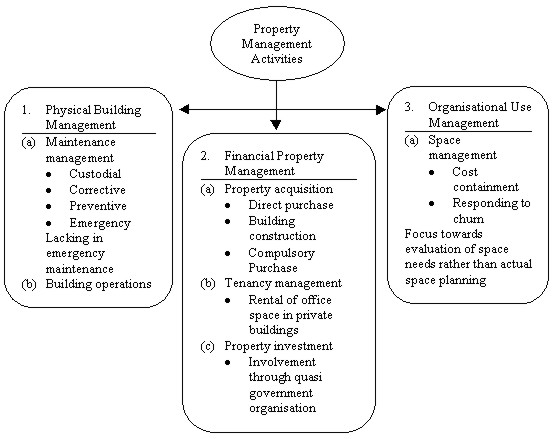 As far as common central government office buildings are concerned, under the supervisions of Ministry of Works (MoW), PMD outsource building maintenance support service according to zone except for those buildings located in Selangor and Kuala Lumpur. The Ministry plans, manages and monitors the outsourced property management work with the help from Building Maintenance Support Service Committees set at up at various affected buildings. PWD carries out buildings maintenance works of office buildings in Selangor and Kuala Lumpur. In the case of an occupier agency manages the office buildings, major maintenance works are outsourced through tender boards and smaller works through quotations sub-committees. Minor technical matters are managed by the organisation with the advice from PWD. Major technical matters are handled directly by PWD. A part from that, a small number of technical staffs is retained within the occupier agency to monitor the outsourced property management work. Managerial staffs within the agency plan and manage the other property management activities. It has to be mentioned that where government agency acquire property through "build, occupy and transfer" (BOT) concept, the entire maintenance management of the subject buildings are also outsourced. 5. THE ISSUE OF PUBLIC SECTOR PROPERTY MANAGEMENT AND COMMENTS5.1 Management ProcessAs mentioned in the foregoing, the responsibilities for property management are distributed among a number of government departments. Public sector property is often managed in a reactive manner. The work is driven either by the short-term requirements of the operations or the property itself. In many instances there is little concern for the long-term requirements. The objectives for property tend to be related to minimising costs in the short term rather than assessing and enhancing the added value property could bring to the organisation. At the same time public sector property management is lacking of performance monitoring. The lack of explicit property objectives led to little monitoring of the performance of property or its management. There is often no awareness of the opportunity cost of property. The effect of this is twofold. First, there is no incentive to use space efficiently. Second, the true cost or performance of the operations is not known because property is effectively a free resource. Property should be actively managed, changing to meet the future needs of the organisations. Specific target should be set and measures of performance established as well as a monitoring and control system. To do so, it is essential to have appropriate management information system that combined operational information with property information. Therefore the move to privatise property management should be viewed on positive mode in delivering quality public sector property management. For example under the BOT concept, property management functions especially facilities for the buildings starts as early as planning stage and follow through construction till complete before the taking over the buildings upon completion. In this manner professional property management firms can manage public office buildings. Apart from this public sector property manager need to take a more holistic view of property management - a portfolio approach. Under this approach the strategic and operational decisions give impact on management effectiveness. Strategic management relates to the property portfolio as whole and seeks to improve the portfolio's overall performance in the long term. Analysis undertaken at strategic level examines the physical, financial and organisational use aspects cross the entire portfolio and the relationship between these factors. Broad policies under strategic management have to be translated into short-term action plan. On the other hand operational management concerns both the implementation of strategic plan via short-term action plan and more proactive management of individual properties. At operational management individual properties are focuses as integrated systems. 5.2 Property Information ManagementAll the three aspects of physical, financial and organisational use of property management require information in order to make informed decision. For example maintenance management is essentially an information problem. Planned maintenance requires a considerable amount of information, thus all records pertaining to property have to be updated. In the same manner, space management also needs data of space inventory in order to embark on space utilisation and to commence to space planning. To date there is no central authority that keeps complete records of all central government property. Most organisations have basic property inventory but it is often difficult to integrate operational with property information. SPTP program under FCLM is not comprehensive to cover all aspect of property database for property management. However, under the privatisation of building maintenance support services for government building, Central Management System (CMIS) is introduced to perform the maintenance management of property. The system comprise of application software packages on facility engineering services including asset register, predictive planned preventive maintenance tasks, and cost and budget control. The monitoring of the system falls within the ambits of MoW. In this context public sector is moving towards having dedicated property information system. Public sector needs a dynamic property management information system that contained data on physical, financial and organisational use of properties. The system should be centralised at a property management department and links to any other departments for the purpose of sharing of informations in oder to make informed decision makings. 5.3 Maintenance ManagementCustodial, corrective and preventive maintenance of maintenance management in public sector are well focused within 