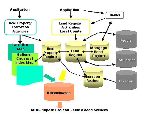 The system provides all responsible agencies with integrated land information i.e. improves efficiency of public bodies. With support from the system the registration of title and mortgage is done the same day as the application arrives. The system also provides integrated information for multi-purpose use in the whole Swedish society. The information is disseminated on-line, direct to the users by NLS or as value added services by information agents. Integrated information together with the national cadaster index map is accessible via Internet and available for more than 4 million citizens. The Real Property RegisterThe real property register is the basic register on real property. It forms the basis for a number of important activities in society such as land registration, real property credit, property taxation, agricultural statistics, land surveying, population registration and urban and regional planning. The register is maintained by a number of cadastral offices throughout the country. Maintenance of the register is basically a task for national government authorities but there are also 39 municipal authorities (the biggest cities), which have responsibility for maintenance within their own jurisdiction. The Land RegisterThe main purpose of land registration is to give publicity and legal protection for acquisition of rights in real property. An orderly, well-functioning land registration system is a prerequisite for guaranteeing security and facilitating economic transactions. Land Register Authorities maintain the Land Register. NATIONAL CADASTRAL INDEX MAPAll land in Sweden is divided into real property units. There are approximately 3.2 millions such units in the country. The Cadastral Index Map is a part of the Real Property Register and gives the geographical representation of the property. The responsibility for building and maintaining the digital map is on shared responsibility bases between the national government authorities and 39 municipal authorities (out of totally 290 municipalities). There are differences between the cadastral register and the index map in Sweden. The register has a certain standard for the information and it is compulsory for both the national government authorities and the 39 municipal authorities to update the real property register. For the cadastral index map there is up to now no unified standard for the whole country and it is not compulsory for these certain municipalities to update a national cadastral index map database. Last year an agreement between National Land Survey and these 39 municipalities however was made concerning deeper co-operation. The main goal out of the agreement is to build a National Cadastral Index Map (NDRK) covering the whole country. NDRK shall: