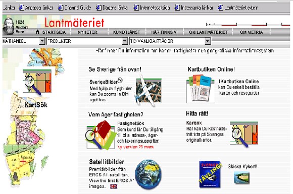 ImplementationThe implementation of the UI 2000 now takes place in a pilot project, where one municipality together with NLS are building a test environment for a general evaluation of the interface. This phase of the project will be completed during autumn this year. The UI will thereafter be implemented for all municipalities INTERNETNLS has launched new Internet service View and buy maps and detailed aerial photos of all of Sweden. It is an e-commerce site where visitors can view and buy aerial photos and maps and search for individual properties Viewing is free of chargeAerial photos covering the whole of Sweden can be viewed free of charge on the web site. You only pay if you wish to order a photo. The photos taken over Stockholm, Gothenburg and Malmö are so detailed that you can see people in them. In the aerial photos of the rest of Sweden, you can distinguish cars. But the site contains a lot more than aerial photos. A map shop, is also included in the new site and will gradually be expanded to include more products. Since January, NLS has offered a well-stocked shop with maps, atlases and nautical charts. Services for estate agents and bankswww.lantmateriet.se also provides two services especially designed for estate agents and banks, etc. These services are called 'FastighetsSök' [property search] and 'KartSök' [map search], and enable users to obtain information on the owners, tax value, addresses, etc. of a particular property by giving an address or clicking on a map. To use these services, you first need to sign an agreement with the National Land Survey of Sweden. The e-commerce site is in Swedish only.