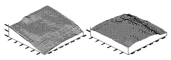 After all the points of each sample area were matched using the resulted matching size, we obtained conjugate points of the sub-pixel unit. 3.4 Determination of The Three Dimensional PositionsObject coordinates were generated by applying the space intersection theory, where conjugate points are resulted by matching, and exterior orientation elements are obtained by the calibration process of systemic error. Figure 4 shows the DEM of each sample area.