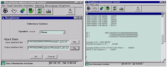 Fig. 6. Roughness measurement module. 4. COMPARISON AND ANALYSISIn order to evaluate measurement processing capability of the DCS 420 digital camera, resultant values of a digital camera were compared with the resultant values of surface roughness obtained by using the Rolleiflex 6006 metric film camera. Sample areas of digital images acquired by the Rolleiflex 6006 metric camera evaluated the same areas as did digital camera. Also, the three-dimensional position of each sample area was computed by applying the space intersection theory, where conjugate points resulting from matching are used for all pixels in the sample area images. Surface roughness is computed with application of mentioned reference plane and reference surface equation using the resulting three-dimensional positions information, as shown in Table 3. Table 3. Average of normal distance between the sample points and the reference surface from the DCS 420 digital camera and the Rolleiflex 6006 camera(unit : mm)
