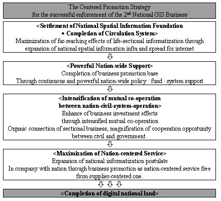 4. THE SECOND MASTER PLAN OF THE NGISTo accomplish the master plan effectively and efficiently, the NGIS steering committee selected several major tasks and projects; a) national framework database, b) development of integrated underground facilities management system, c) development of thematic maps and public utilization system, d) establishment of national clearinghouse, e) standardization of geographic information, f) GIS human resource development The figure 1 and 2 are a promotion strategy and plan of the second master plan, respectively