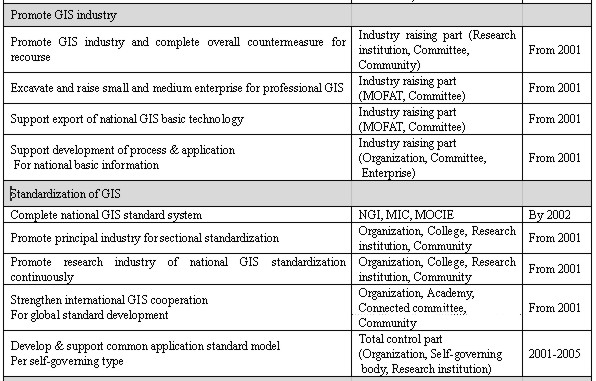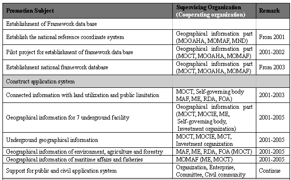 Figure 2. Classified Promotion Plan 4.1 Establishment of National Framework Data baseFramework data is the fundamental data set as a basic and reference map to which specific information can be added for the respective purpose of diverse GIS application areas. As a first step of establishing national framework data base, National Geography Institute (NGI) with local governments focused on the digitalizing of the national base maps, which is scales 1:1,000, 1:5,000, 1:25,000, since 1995. The digitalization of base map completed by the end of 2000.