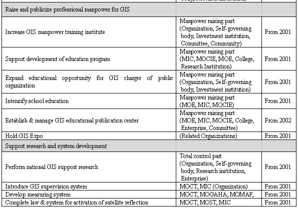 Geographic information production The National Geography Institute (NGI) played a key role in defining the standards in geographic information production. A total of ten of standards were established in this area (including national base map, underground utility map and thematic map). Geographic information distribution/application Two standards were established in this area (including a temporary metadata standard and a data exchange standard (SDTS)). These standards aimed at exchanging and searching the geographic data produced by many different organizations and agencies. For the second stage of the NGIS plan starting in 2001, the strategy and plan on national standards are being arranged to cope with recent technology development, as well as to meet the wide range of customers' requirements. 4.5 Technology DevelopmentFor the development of GIS technologies, approximately US$22.75 million was allocated during the first 5 year master plan. Technology development has been in made for area; i) GIS system integration technology, ii) Mapping, iii) DB tool; iv) GIS application software. 4.6 Human Resource DevelopmentHuman resource development issues are also indispensable element to realize the objectives and goals of NGIS. The NGIS committee is going to increase professional manpower who are involved in NGIS activities, both in government and business. GIS professional manpower training for has been done mainly in university, government run training institute and business institute. As a part of increasing professional manpower training, the NGIS committee is also considering to develop virtual GIS training center which provides cyber-training course through internet. 4.7 Computation of Investment ScaleShare the investment source for the public and civil partnership and induce investment to the civil section. Procurement plan for financial resources such as total investment scale, sectional investment scale and share with civil section will be promoted after consultation with connected section such as the Ministry of Planning and Budget. Table 1. Estimated Investment (Unit : Million WON)