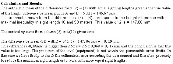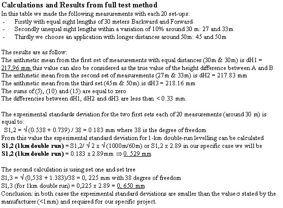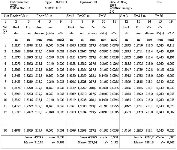 Again all observations on both staffs A and B are made for 10 set-ups: Evaluation of the results Explanations for the calculation and the evaluation of the check are provided in the annexe. The full test procedureThis field method is proposed for the determination of the highest achievable precision using one specific type of equipment. Normally it is for precise levelling (linear applications) where high accuracy is demanded and the set-up observations are made with equal lengths backwards and forwards. The accuracy will be expressed in terms of the standard deviation of 1km double-run levelling. For its implementation we have to establish a test line AB of about 60m in a plane area with homogenous ground surface (gravel preferably) free from vegetation or other disturbing factors (water plane, grass). A and B have to be stable during the whole operations. The chosen site length will be 30m, which is the recommended distance for precise levelling in many countries. Note: