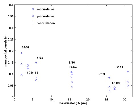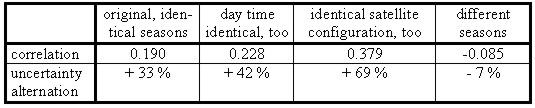The equation demonstrates, that negative correlations decease and positive correlations increase the uncertainty of differences. Typical GPS-applications are the single, double and triple differences algorithms of GPS evaluation software. As another example the analysis of deformations may serve. In this case differences among co-ordinates of two or even more deformations epochs have to be realized. Table 2 shows interepochal correlations as well as alternations of the uncertainties of height-deformations, both estimated in a synthetic way (SCHWIEGER 1999a). The influence of day time, season and satellite configuration is obvious (compare chapter 2.1). The gain for the standard deviation of the height deformation (baseline 36-39) reaches an amount of almost 70 %, if identical satellite configurations, season and day time are simulated.