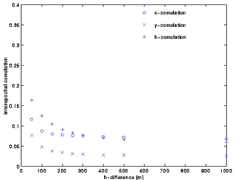 Figure 5: Interepochal height correlation in dependence of the height difference (baseline 36 -39) The research was realized for a vertical control network located in Romania in the Carpathian mountains (figures 2 and 3). It was observed by levelling in earlier times. In 1992 and 1993 the network was remeasured by GPS. So called interepochal correlations among the co-ordinates between the deformation epochs were determined by the synthetic methods described above. In Figure 4 the interepochal correlations determined for selected baselines of the network are shown. The computations result in maximum correlation coefficients of approximately 0.19. Simulations have shown that these correlations essentially depend on the baseline length, the height difference of the stations and the individual satellite configurations. The influence of the height difference for baseline 39-36 is presented in figure 5. The important influence of the day time and the season is documented by table 2 (chapter 3). The estimable correlations coefficients are of the magnitude that they have to be taken into account for the determination of uncertainties and other geodetic quality criteria (SCHWIEGER 1999a and 1999b). Some characteristic results are shown in chapter 3. The interepochal correlation coefficient reaches 0.38 for identical day time, season and satellite configuration. 2.2 Analytic Determination of Correlations