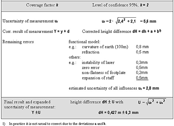 Table 1: Scheme for the calculation of the uncertainty of measurement of rotating lasers (numerical values are fictive) 5. CONCLUSIONSIt is obvious that there are two major reasons for reconsidering the approach of stating the measurement uncertainty as a suited quantitative measure of accuracy in testing and calibrating geodetic instruments: