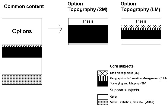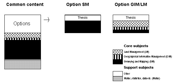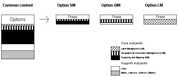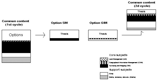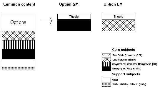 Figure 9. Surveying education (4 years) at Dublin Institute of Technology. (Source: DIT 1999) Ireland Surveyors in Ireland have, in principle, no responsibility for property formation. A comparison can be made with the UK, where surveyors had this responsibility during the enclosure movement (land consolidation) but later lost it. The consequence for both countries has been that the surveying profession has been divided into land surveyors, with mainly technical skills, and other types of surveyor. The other group includes, for example, general practice surveyors (economic experts), quantity surveyors (who cost construction projects) and planning surveyors. Culturally, the two countries are similar, with a common history and the same language. University education also has much in common. To show the breadth of studies in the two countries, two programmes will be described. The first is Geomatics in Dublin, Ireland. The other is a combined programme in Glamorgan, Wales, for Planning and Development Surveying and Property Management and Valuation (see UK). The only programme in Ireland devoted entirely to technical surveyors is provided by Dublin Institute of Technology and was introduced in its present form in 1999. It is a four year course with the final half-year concentrating on thesis work. The Institute admits 35 students annually. Students spend the equivalent of three years studying a common course programme. Three-quarters of a year are devoted to Maths and a similar period to other support courses (fig. 9), of which half are in professional and business management. The management courses are considered strategically important for future professional practice and are in reality included in the specialisation at the end of the study period. Their purpose is to train project leaders. The common surveying block (SM) lasts for just over a year. The element of GIM is also conspicuous, whereas land management plays a very minor part in the common core foundation programme. After just over three years students choose between three specialities, namely Geodetic Surveying (SM), Geographical Information Management (GIM) and Land Management (LM). The subjects studied are closely connected to the main speciality area. Courses last for half a year. Other Irish universities have programmes focusing on real estate economics (general practice surveyors) etc.